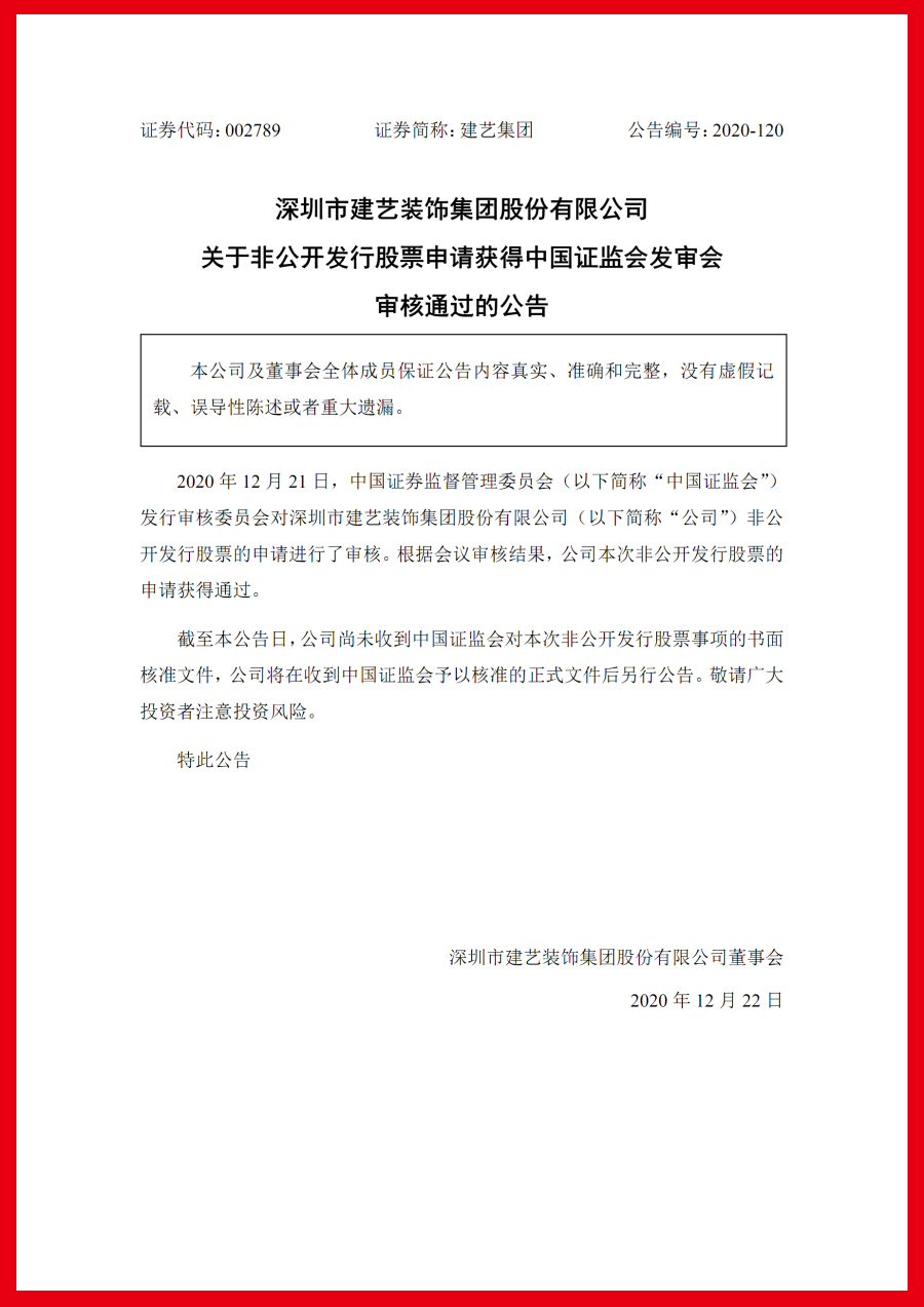 《建藝集團(tuán)關(guān)于非公開發(fā)行股票申請獲得中國證監(jiān)會(huì)發(fā)審會(huì)審核通過的公告》