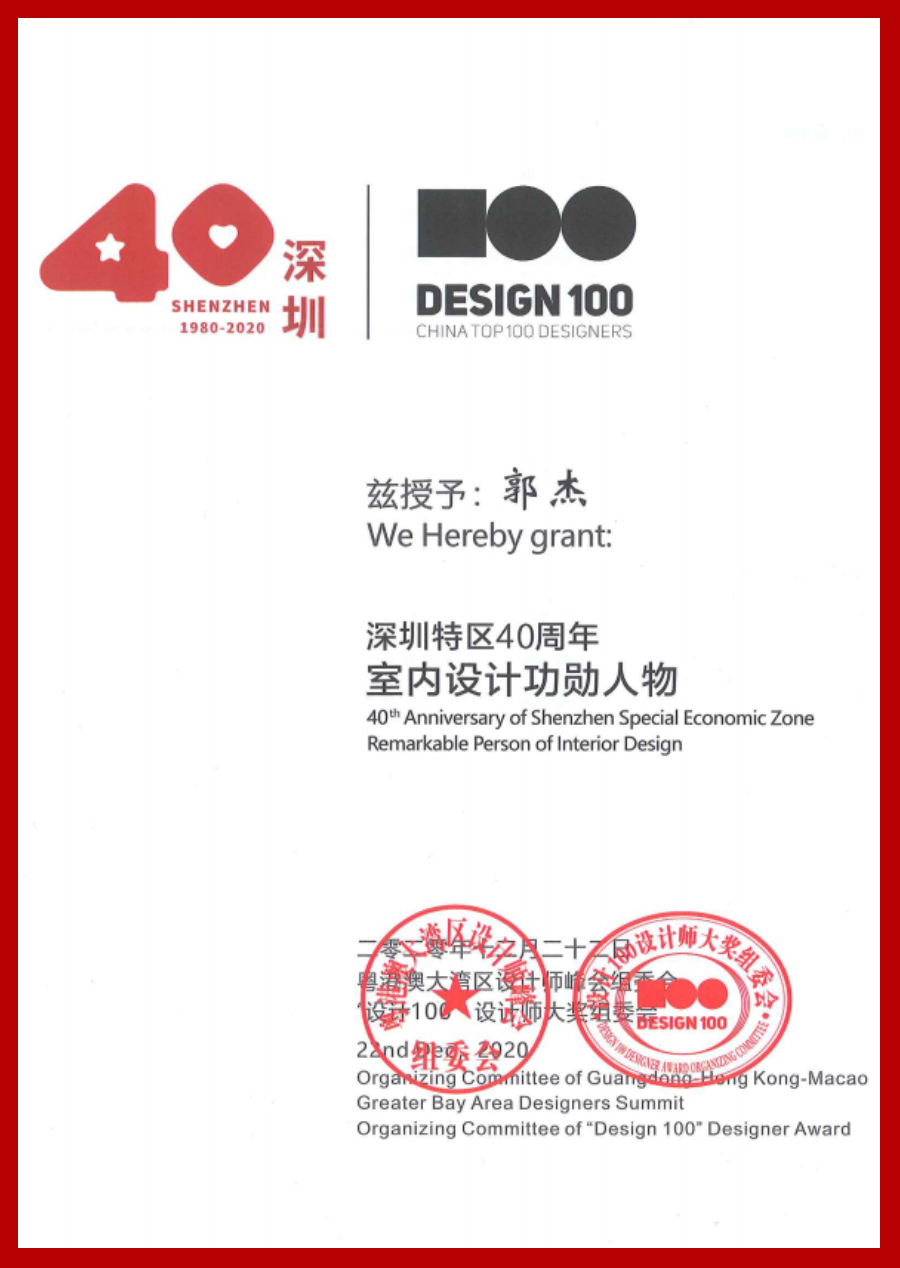 此次獲得“‘設(shè)計100’——深圳特區(qū)40周年:室內(nèi)設(shè)計功勛人物”及“首屆深圳工程師優(yōu)秀科技人才——功勛工程師”雙料殊榮,不僅是對郭杰院長及建藝集團(tuán)設(shè)計研究院長期以來推動、促進(jìn)、影響建筑裝飾設(shè)計領(lǐng)域蓬勃發(fā)展的認(rèn)可與表彰,更是對“建藝設(shè)計”未來繼續(xù)高品質(zhì)輸出,打造“深圳質(zhì)量”繼續(xù)引領(lǐng)行業(yè)不斷前行的激勵與期盼。放眼未來,“建藝設(shè)計”將繼續(xù)在郭杰院長的領(lǐng)導(dǎo)下,秉承“匠心”,為“深圳品質(zhì)”助力打造“美麗中國”之愿景而持續(xù)奮斗;不斷努力,為深圳“雙區(qū)”建設(shè)貢獻(xiàn)力量!