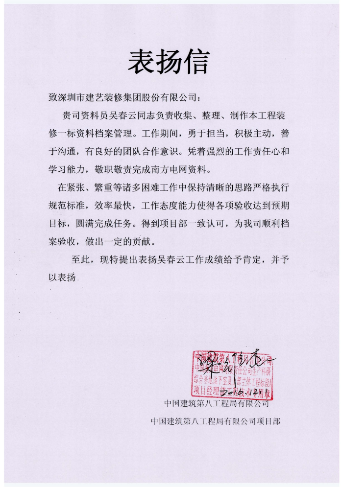 建藝集團(tuán)工程管理中心吳春云獲得的表?yè)P(yáng)信