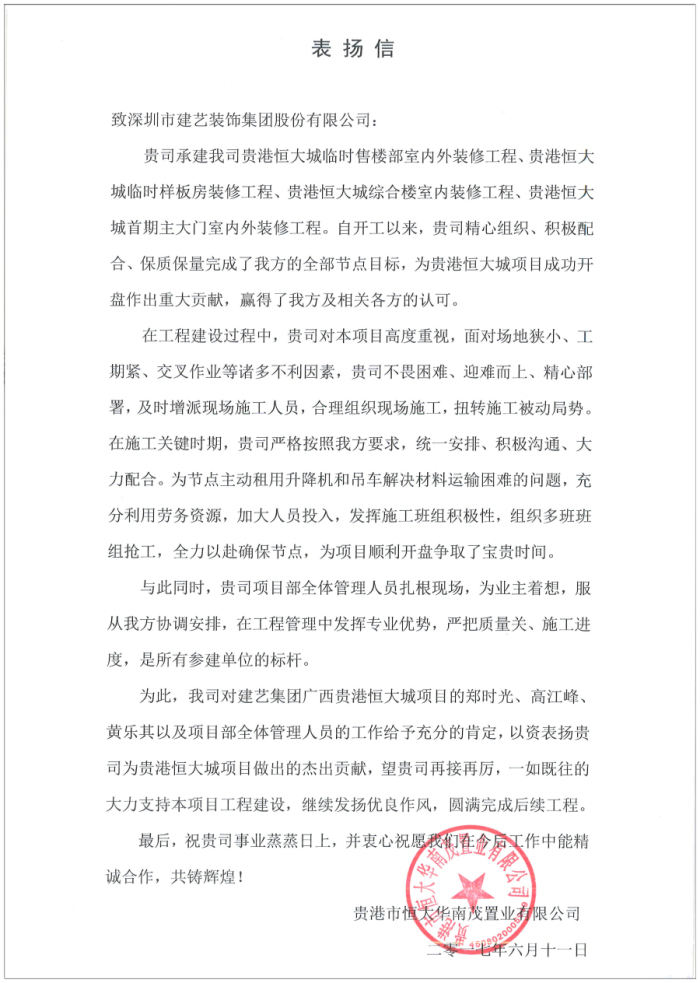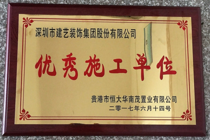 貴港市恒大華南茂置業(yè)有限公司授予建藝集團榮譽獎牌