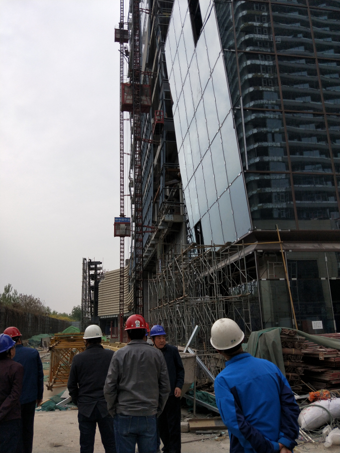 考察團一行領(lǐng)導查看我司施工的斜面玻璃幕墻效果