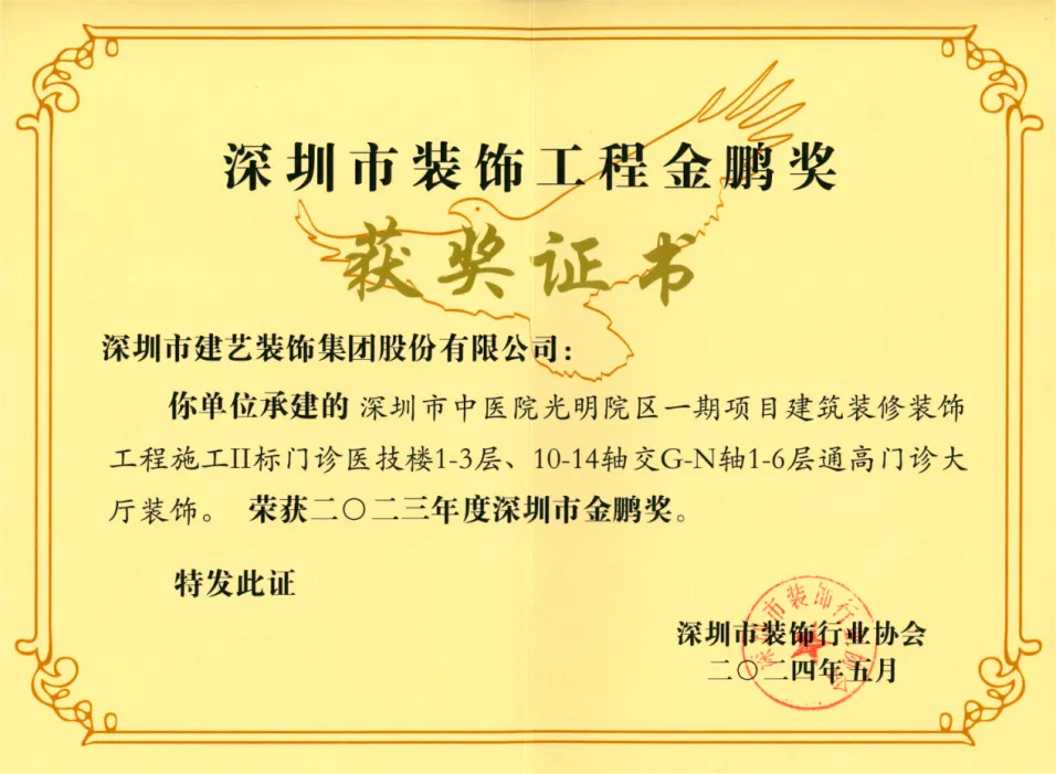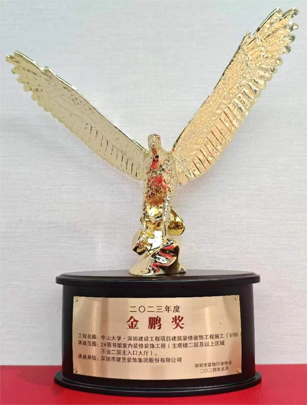 近日,由深圳市裝飾行業(yè)協(xié)會(huì)組織評(píng)選的2023年度深圳市裝飾工程“金鵬獎(jiǎng)”獲獎(jiǎng)名單揭曉,由建藝集團(tuán)承建的中山大學(xué)?深圳建設(shè)工程項(xiàng)目建筑裝修裝飾工程施工(VI標(biāo))、深圳市中醫(yī)院光明院區(qū)一期項(xiàng)目建筑裝修裝飾工程施工II標(biāo)項(xiàng)目、深圳職業(yè)技術(shù)學(xué)院留仙洞校區(qū)G棟學(xué)生宿舍建設(shè)工程項(xiàng)目裝修裝飾工程,共計(jì)3項(xiàng)工程榮獲嘉獎(jiǎng),企業(yè)的技術(shù)優(yōu)勢(shì)和施工水準(zhǔn)再獲行業(yè)肯定。