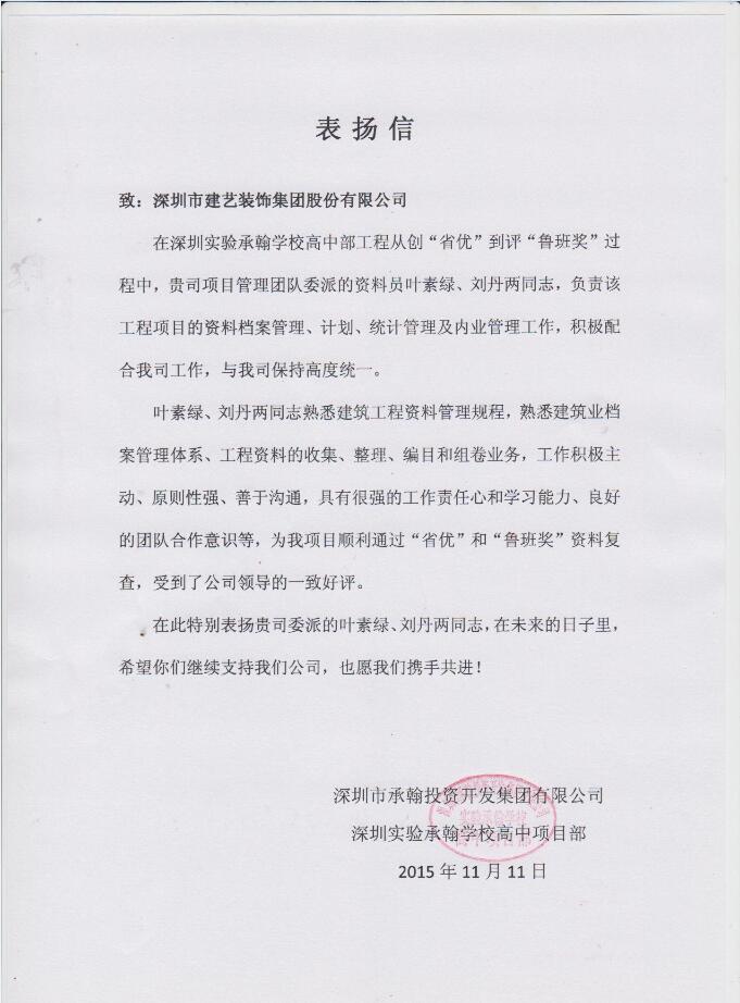 日前,建藝集團(tuán)工程管理中心資料員葉素綠、劉丹在負(fù)責(zé)深圳實(shí)驗(yàn)承翰學(xué)校高中部工程的資料檔案管理、計(jì)劃、統(tǒng)計(jì)管理及內(nèi)業(yè)管理工作期間,工作積極主動(dòng),憑借強(qiáng)烈的工作責(zé)任心與團(tuán)隊(duì)合作意識(shí),獲得了項(xiàng)目部的一致認(rèn)可,受到通報(bào)表揚(yáng),體現(xiàn)出了建藝人的敬業(yè)精神,并為該工程順利通過“省優(yōu)”及“魯班獎(jiǎng)”評(píng)獎(jiǎng)資料復(fù)查做出了突出貢獻(xiàn)。