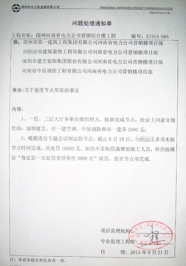 日前,建藝集團國網(wǎng)河南省電力公司營銷綜合樓內(nèi)裝飾工程施工項目部因組織得力、管理有方,并在施工過程中克服了人員不足、技術(shù)力量有限、工期進(jìn)度要求緊、持續(xù)高溫等諸多不利因素,項目部管理人員以身作則,以高度負(fù)責(zé)的責(zé)任意識全面提高施工效率,并采取24小時現(xiàn)場監(jiān)管及第一時間處理突發(fā)問題等一系列強有力措施,按時保質(zhì)保量的完成了項目多個節(jié)點進(jìn)度目標(biāo),受到了業(yè)主方的嘉獎,為建藝集團再次爭得榮譽,同時也為項目部樹立了新的標(biāo)桿。