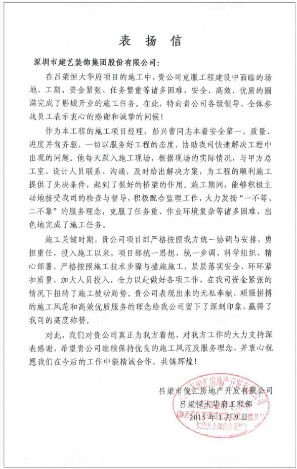 我司承建的山西呂梁恒大華府影劇院項(xiàng)目,在面臨前期相關(guān)方進(jìn)度嚴(yán)重滯后等嚴(yán)峻挑戰(zhàn)時(shí),項(xiàng)目部工程人員克服種種困難,不怕苦,不怕累,精心組織,科學(xué)安排,全力沖刺,全力配合,最終憑借努力付出,達(dá)到了業(yè)主方的進(jìn)度目標(biāo)要求,確保了影劇院準(zhǔn)時(shí)開(kāi)業(yè)。業(yè)主方對(duì)我司工程人員的高超管理水平以及對(duì)項(xiàng)目工作的高度負(fù)責(zé)任精神表示極大認(rèn)同,對(duì)我司在該項(xiàng)目上所做出的巨大努力和突出表現(xiàn)表示了高度贊揚(yáng)!