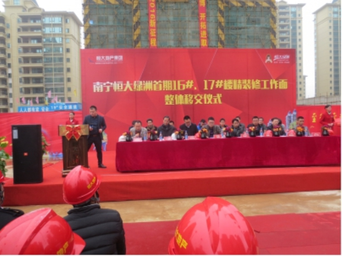 近日,由建藝集團承接的廣西南寧恒大綠洲首期16#、17#樓精裝修工作面移交儀式在綠洲首期工地隆重舉行。