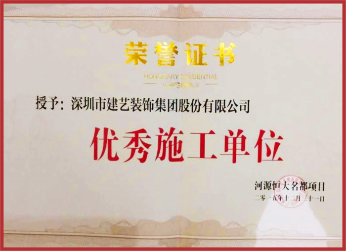 建藝集團(tuán)獲得的“優(yōu)秀施工單位”榮譽證書