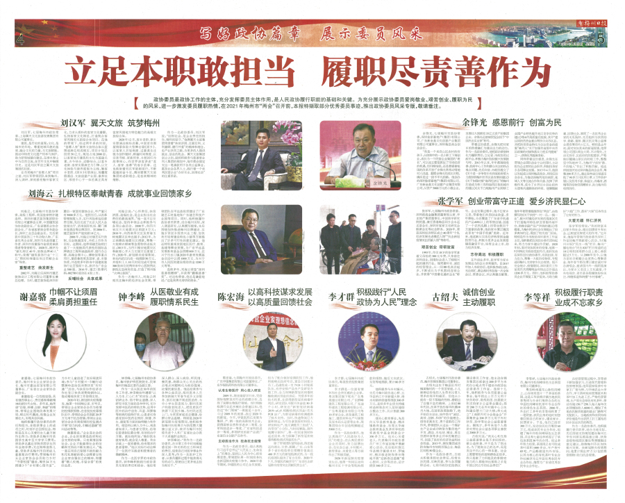 政協(xié)委員是政協(xié)工作的主體,充分發(fā)揮委員主體作用,是人民政協(xié)履行職能的基礎(chǔ)和關(guān)鍵。為充分展示政協(xié)委員愛(ài)崗敬業(yè)、艱苦創(chuàng)業(yè)、履職為民的風(fēng)采,進(jìn)一步激發(fā)委員履職熱情,在2021年梅州市“兩會(huì)”召開(kāi)前,《梅州日?qǐng)?bào)》特?cái)X取建藝集團(tuán)董事會(huì)主席劉海云等部分優(yōu)秀委員事跡,推出政協(xié)委員風(fēng)采專(zhuān)版。報(bào)道原文如下: