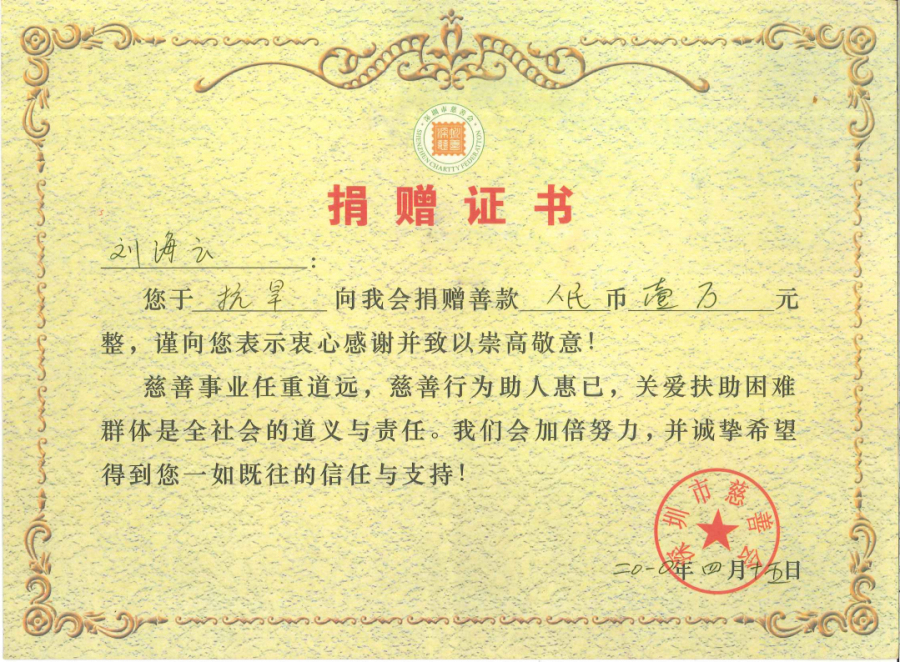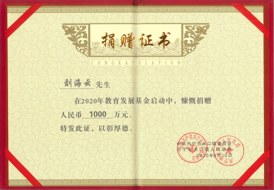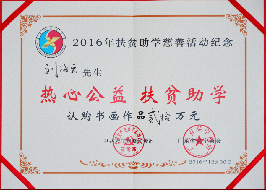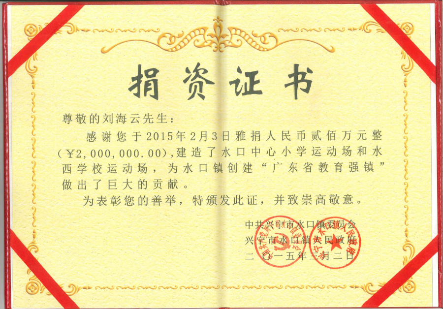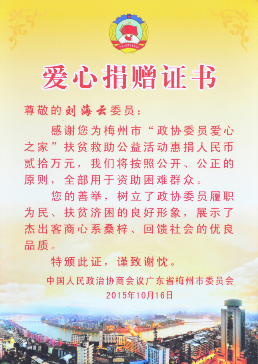 在2019年度“廣東扶貧濟(jì)困日”活動(dòng)中,劉海云向平遠(yuǎn)縣仁居鎮(zhèn)捐贈(zèng)善款100萬元,用于支持當(dāng)?shù)氐缆窐蛄航ㄔO(shè);廣東興寧水口鎮(zhèn)洋新村老人活動(dòng)中心新農(nóng)村建設(shè)共捐贈(zèng)900多萬元;廣東平遠(yuǎn)縣扶貧助學(xué)捐助270萬元;廣東興寧教育強(qiáng)市捐助200萬元;廣東興寧公益慈善共捐630萬元;廣東平遠(yuǎn)縣發(fā)展教育基金會(huì)成立暨捐贈(zèng)儀式上向基金會(huì)捐贈(zèng)800萬元;廣東興寧市水口鎮(zhèn)2020年教育發(fā)展基金啟動(dòng)中帶頭認(rèn)捐1000萬元……