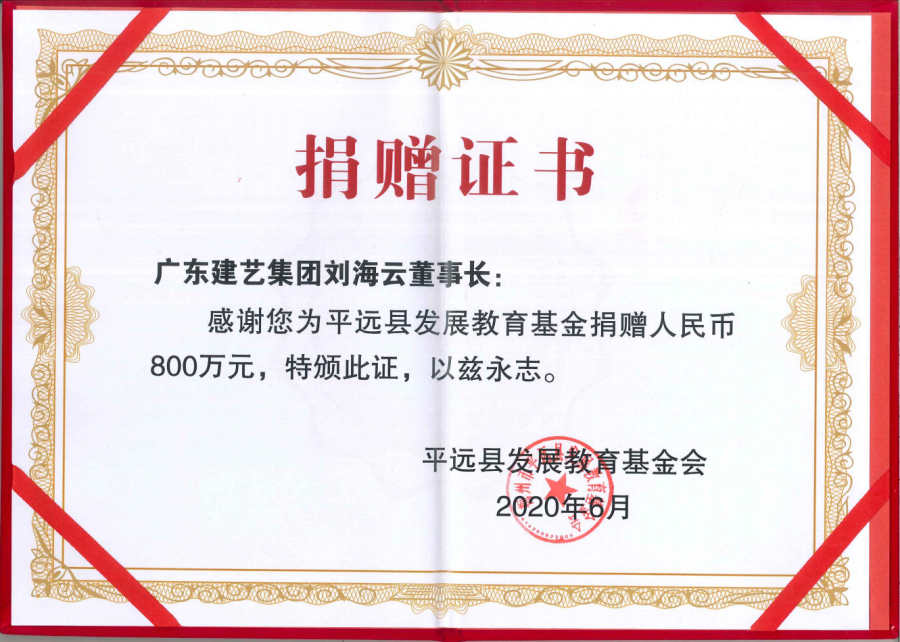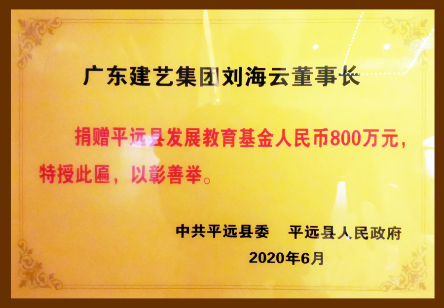 從1994年成立至今,作為廣東企業(yè)500強(qiáng)的建藝集團(tuán),始終把“以德為先,誠信為本,構(gòu)筑精品為目標(biāo)”的企業(yè)宗旨體現(xiàn)在促進(jìn)國家、民族與社會(huì)的繁榮進(jìn)步之中。董事會(huì)主席劉海云更是以身作則,堅(jiān)持用大愛回饋社會(huì),累計(jì)捐資數(shù)千萬元,為大批貧困地區(qū)提供支持,極大促進(jìn)了當(dāng)?shù)亟逃?、醫(yī)療、民生等事業(yè)的進(jìn)步發(fā)展。