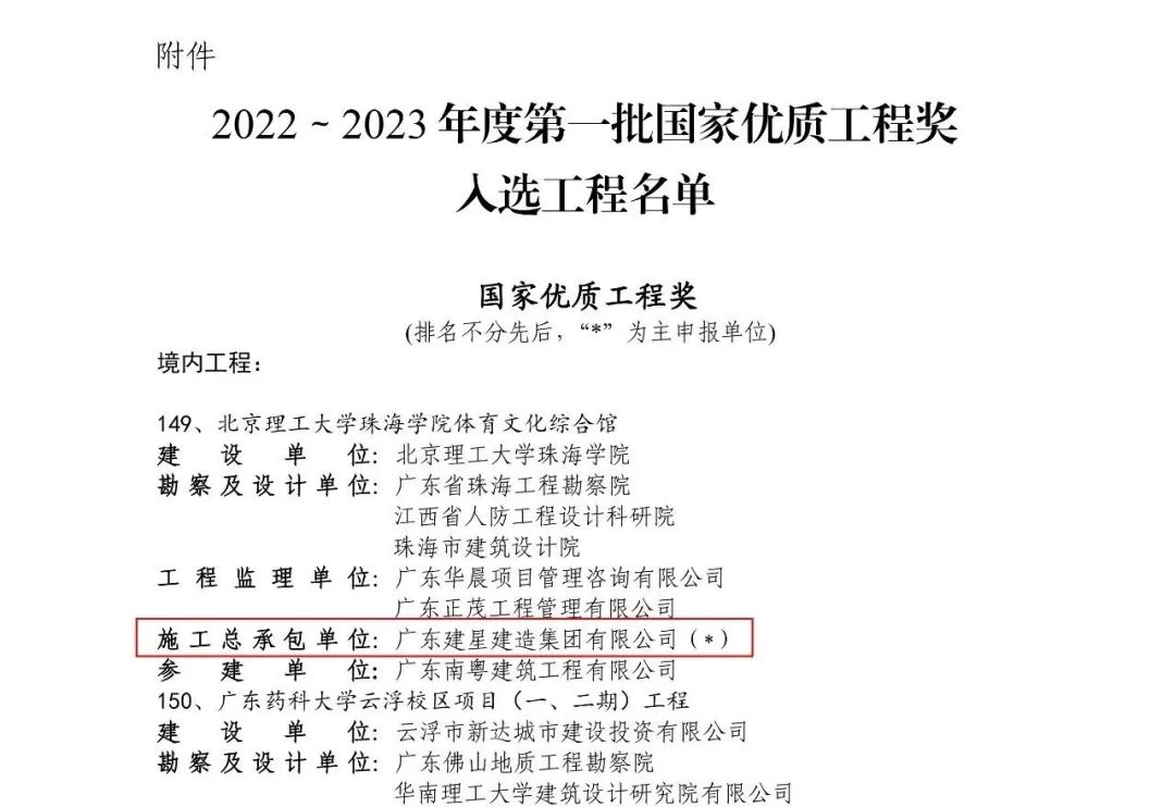 近日,2022—2023年度第一批國家優(yōu)質(zhì)工程獎評選結果揭曉,由建藝集團旗下建星集團承建的北京理工大學珠海學院體育文化綜合館工程榮獲“國家優(yōu)質(zhì)工程獎”。