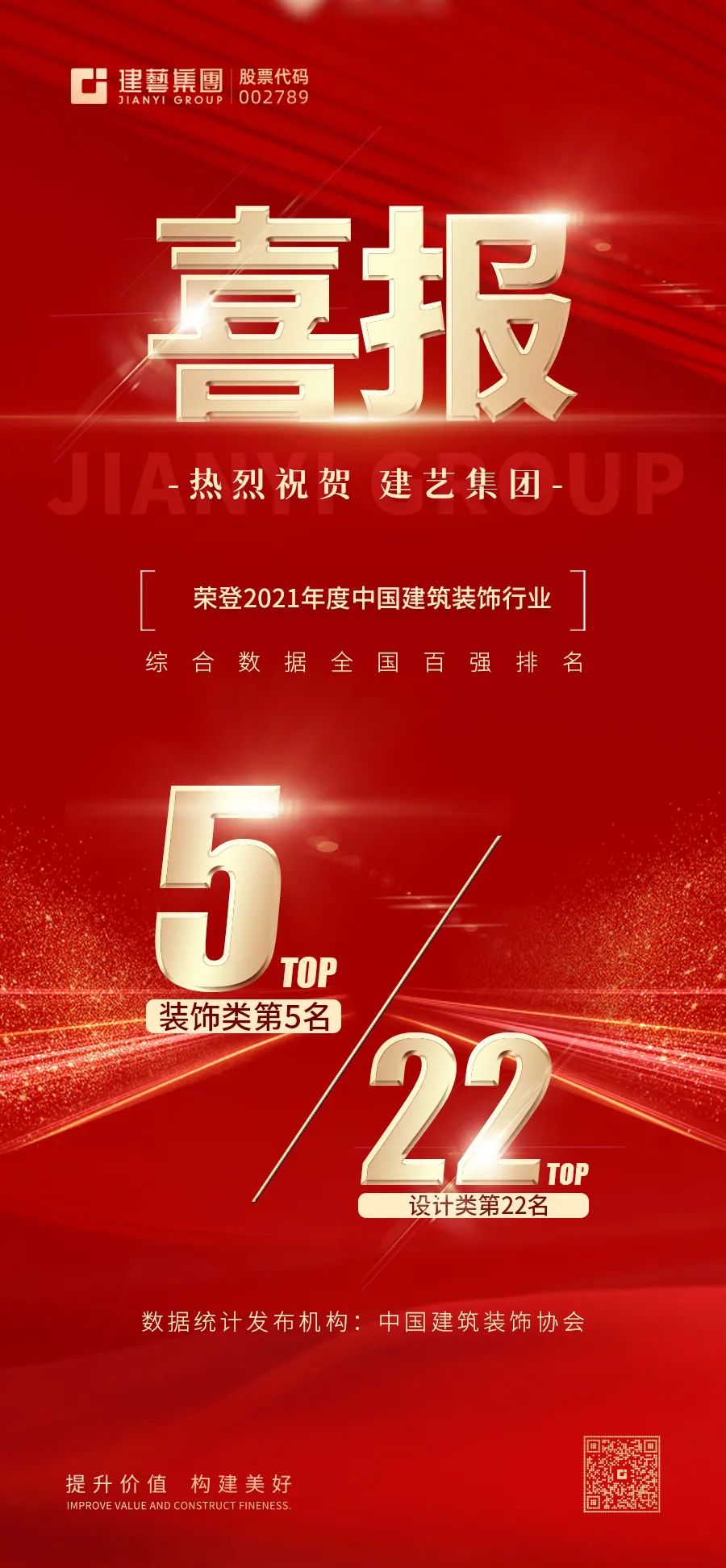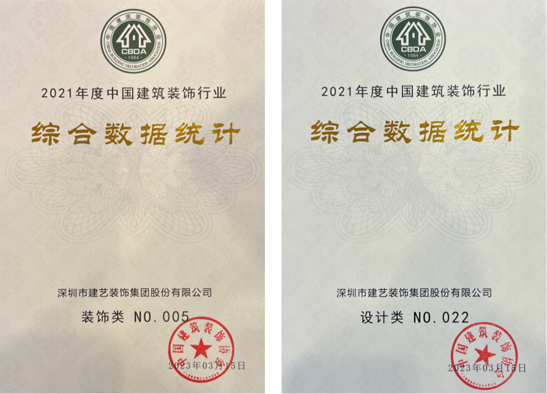 【重磅】建藝集團連續(xù)榮登中國建筑裝飾行業(yè)綜合百強榜排名裝飾類第5名和設(shè)計類第22名