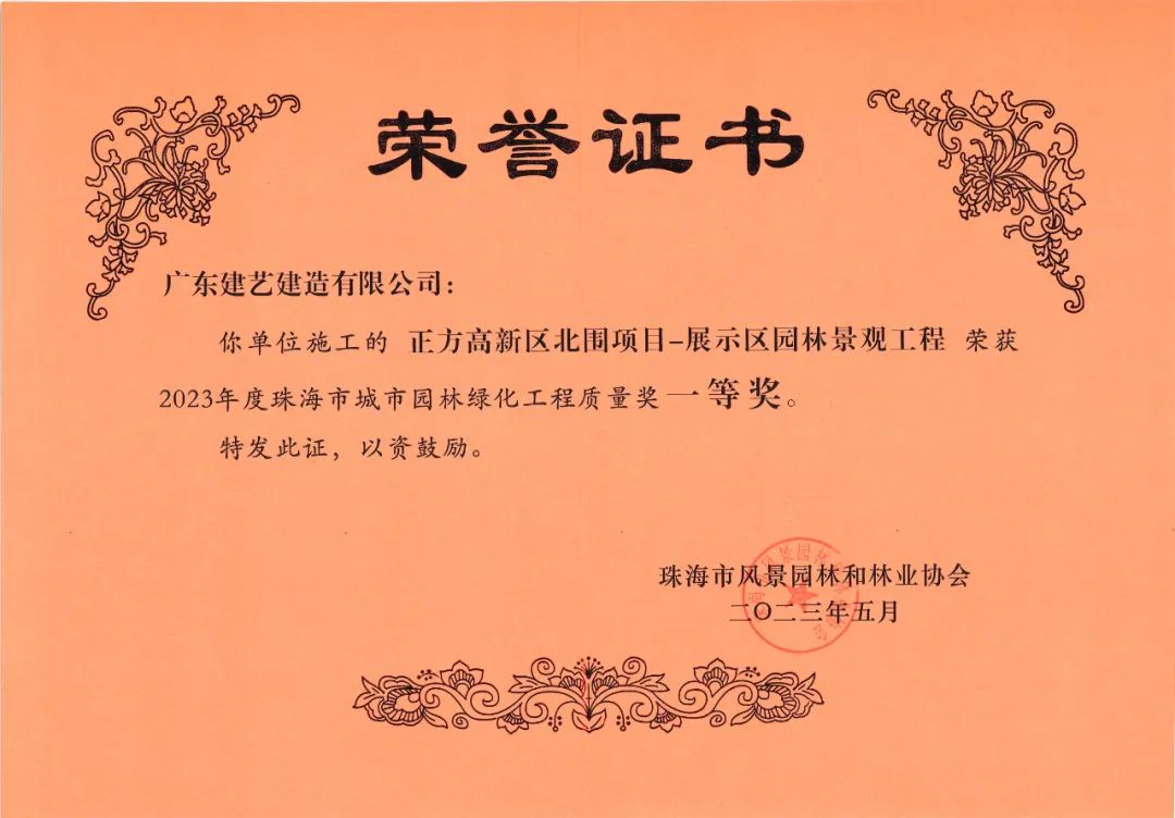 近日,由珠海市風(fēng)景園林和林業(yè)協(xié)會(huì)主辦的珠海市城市園林綠化工程質(zhì)量獎(jiǎng)評(píng)選活動(dòng)落下帷幕,深圳市建藝裝飾集團(tuán)股份有限公司旗下廣東建藝建造有限公司承建的正方高新區(qū)北圍項(xiàng)目-展示區(qū)園林景觀工程榮獲“2023年度珠海市城市園林綠化工程質(zhì)量獎(jiǎng)”一等獎(jiǎng)。