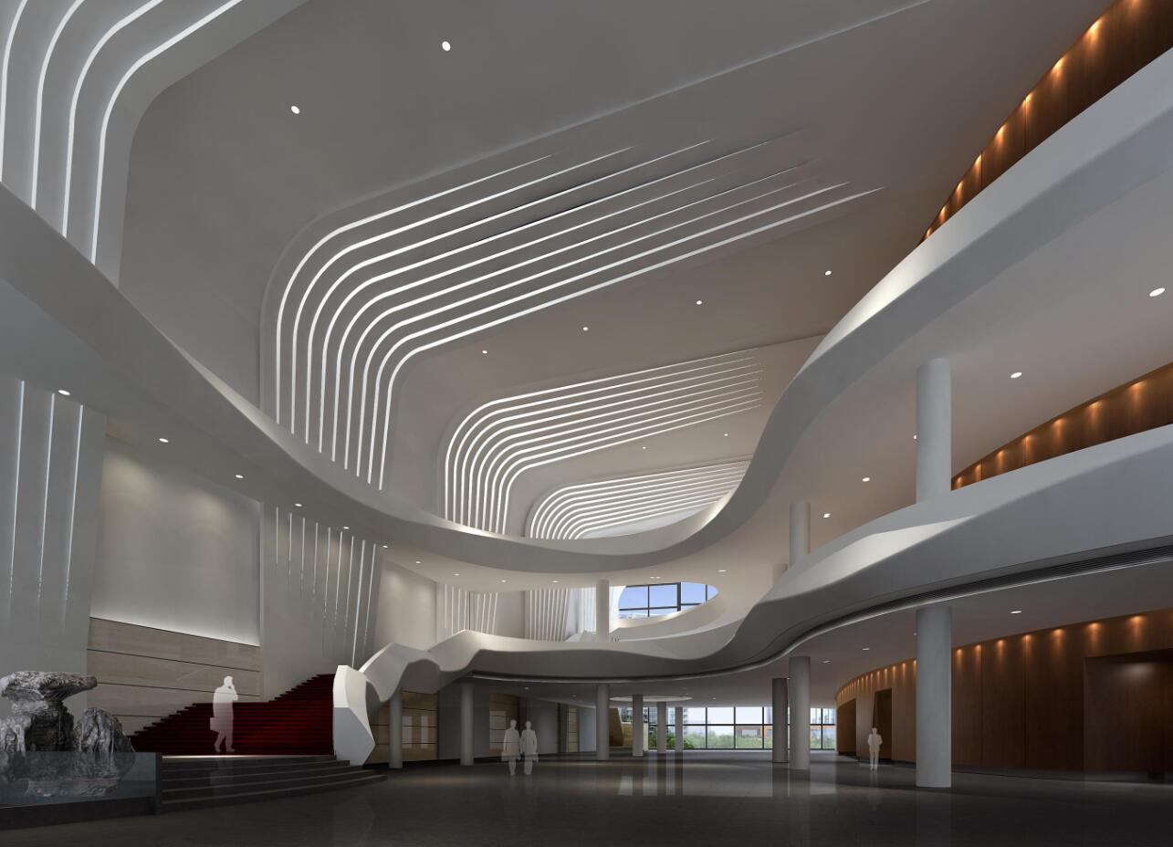 安徽廣電新中心西區(qū)大堂的室內(nèi)設計是整體建筑中最具代表性的空間設計,大堂建筑空間恢宏大氣,三層空間挑高高達23米,主廳呈U形布局,三層流線型的回馬長廊貫穿之中,設計師充分挖掘了材質的特點,GRG材料造型欄板,打破了攔河給人的固有印象,創(chuàng)造性地使其展現(xiàn)扭曲變化的“韌性”造型,用抽象雕塑的手法表現(xiàn)了穿云破霧的“行龍”,仿佛有一種呼嘯著從遠處側廳奔騰而至的生命力,橫貫穿行在各空間里,充滿靈動和奮進的張力;體現(xiàn)出一種自由飄逸、奔放磅礴的氣勢;而與之呼應的是在側墻上三面巨大而舒展的翅形設計,暗藏的LED燈帶輝映其側,抽象地提煉出吉祥鳥“鳳凰”的翅膀形態(tài),其與橫向穿行的“行龍”在豎向上相呼應,表現(xiàn)出一種龍興鳳舉、龍鳳呈祥的戲劇性效果,設計師通過對中國傳統(tǒng)元素的提煉及概括性的演繹,用現(xiàn)代、時尚的語素去表達主題,在空間視覺上給人強烈的沖擊力。