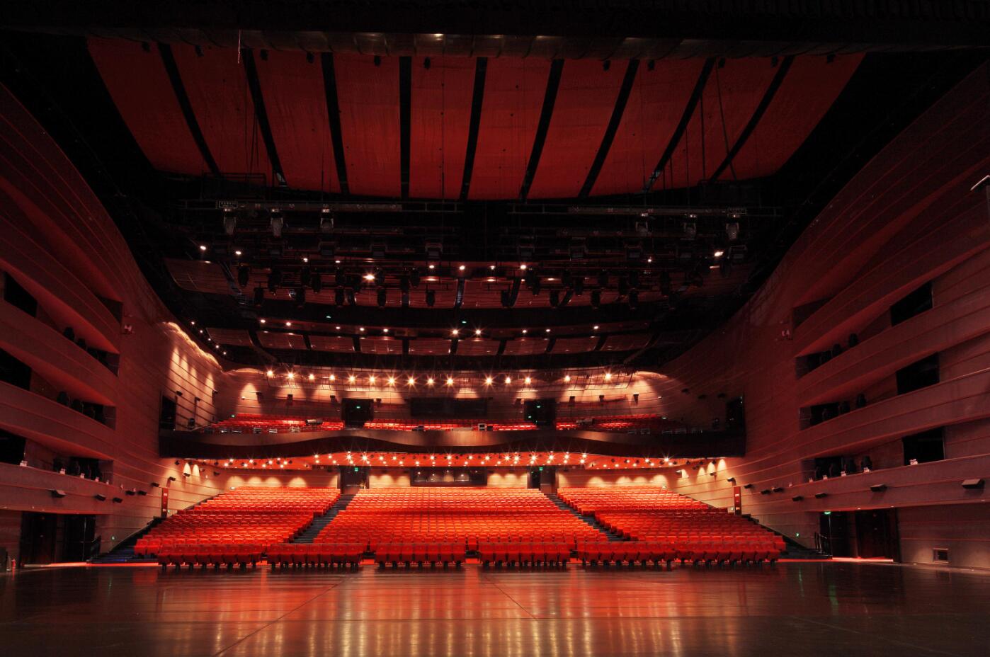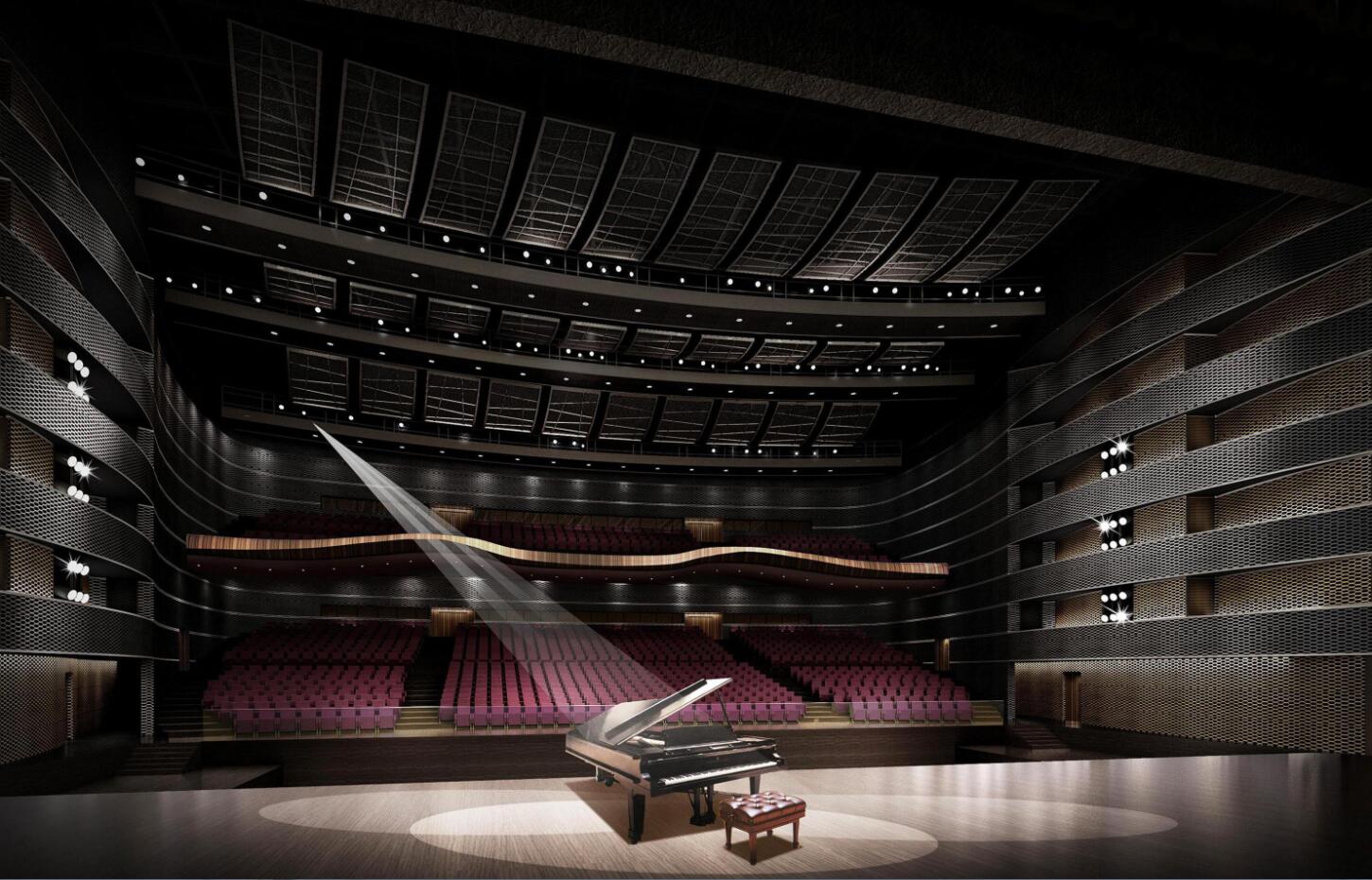西區(qū)多功能演播廳是目前亞洲最大的專業(yè)演播廳,其專業(yè)舞臺面積達3600㎡,觀眾席1800座,其中固定坐席300座,劇場面積約9000㎡。運用了香檳色的剛質金屬張立構造網(wǎng)來作為主立面表層裝飾主材,大氣而舒展,其良好的穿透性,保證了其后面聲設計構造作用的最大發(fā)揮,使聲音的吸收與反射結構都巧妙地隱藏在統(tǒng)一的網(wǎng)層下,在立面上形成獨特的雙表皮裝飾造構,紅色的聲學造構內(nèi)襯與香檳的金屬網(wǎng)在燈光的映射下,從不同角度折射出不同的光暈表情,使室內(nèi)空間充滿韻味。在天花的裝飾設計上,同樣遵循了聲學設計的要求,在保證空場混響時間指標的前提下你在反射區(qū)域和吸收區(qū)域巧妙地進行裝飾,使用弧型的鋁質張立網(wǎng)懸吊構造,其黑色輕盈的造型與紅色厚重的GRG聲學反射板相融合,讓觀者在視覺與感觀上產(chǎn)生一種沖撞與對比的感受,并且兩種形態(tài)又能很好的融合在整體的天花造型中,實現(xiàn)了天花裝飾設計上功能性與美觀性的和諧統(tǒng)一。
