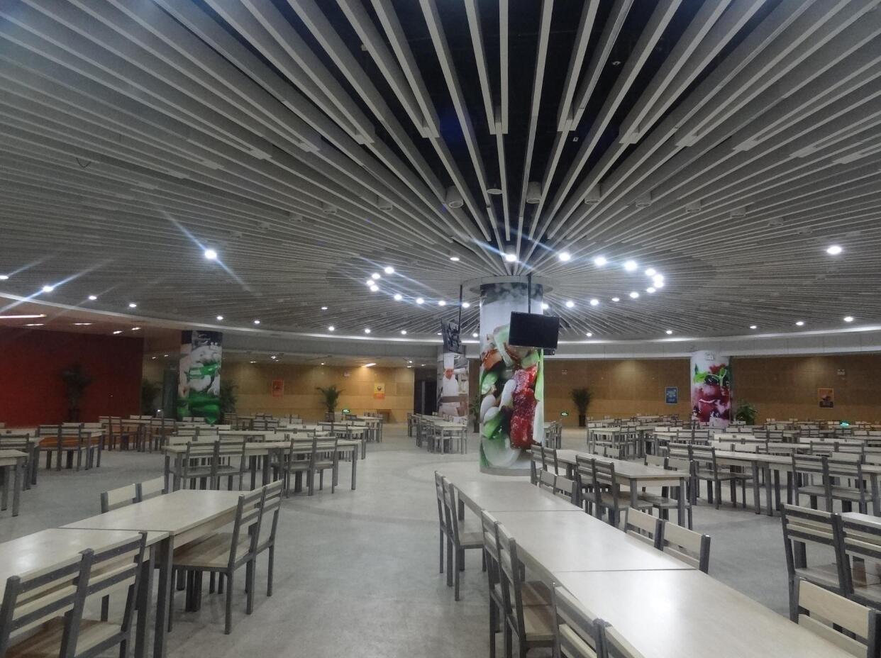 員工餐廳及辦公樓各樓層區(qū)域在設計上大量使用環(huán)保節(jié)能的材料,做到低材廣用,大氣簡約,又在大整體中見細節(jié)的精致。地面為拼花橡膠地板,頂面為圓形鋁方通造型頂,活潑的照明方式、相呼應的造型吊頂,讓員工在用餐之余,有不一樣的視覺體驗。
